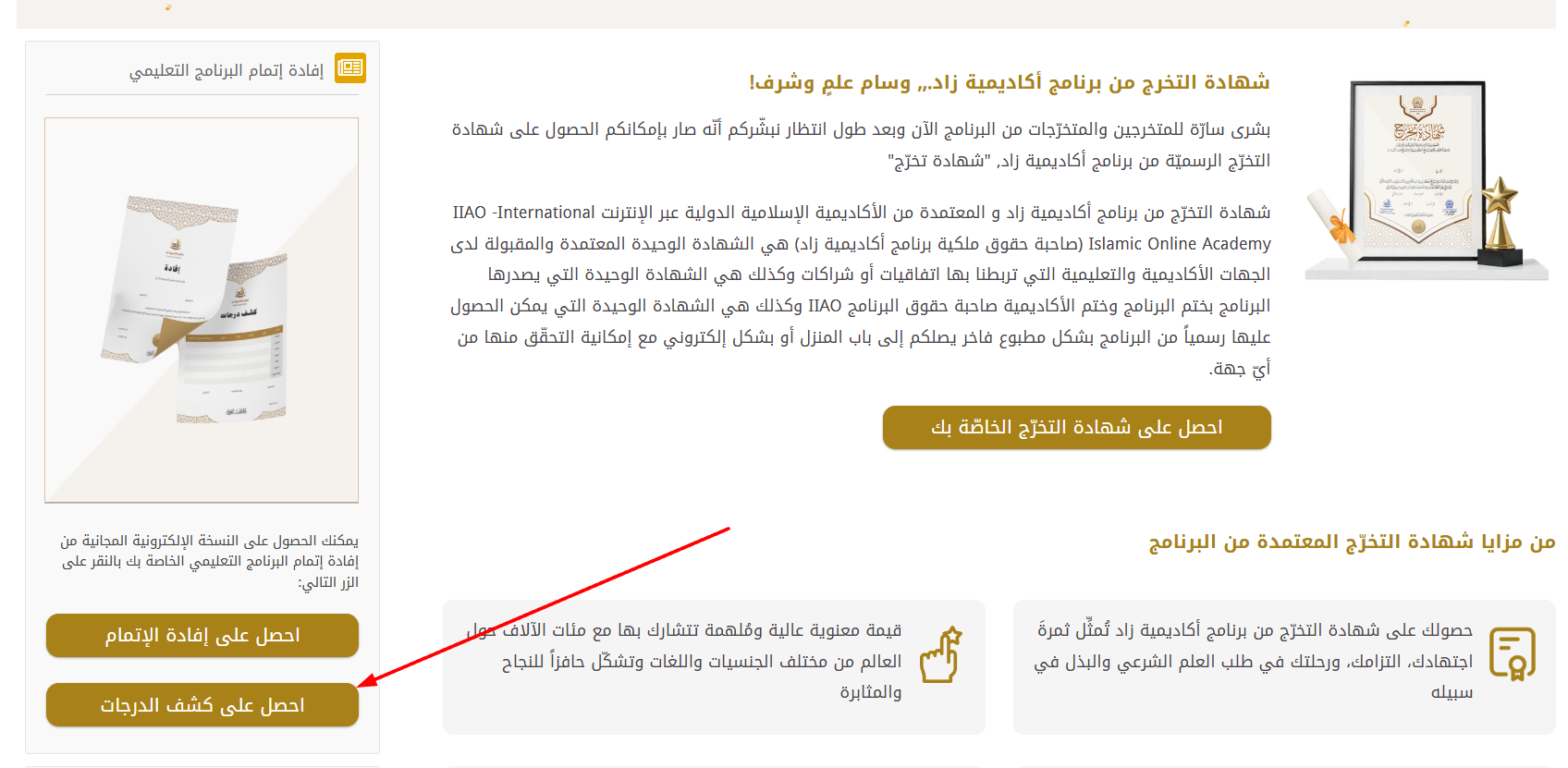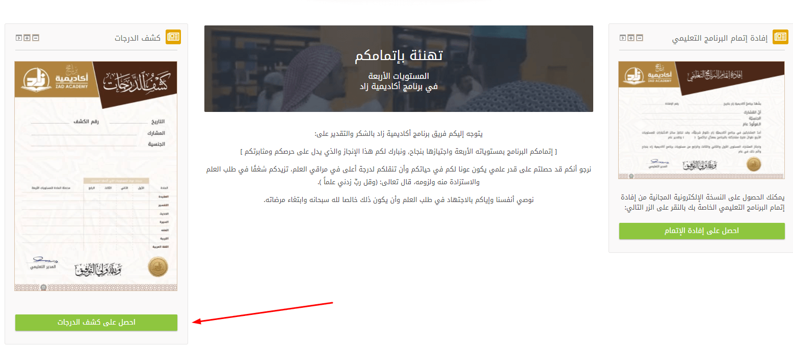 يتوفر في حساب الخريجيين لمن أنهى المستويات الأربع كشف درجات رسمي يحتوي الدرجات النهائية للمستويات الأربعة في كل المقررات التي اجتازها المشارك