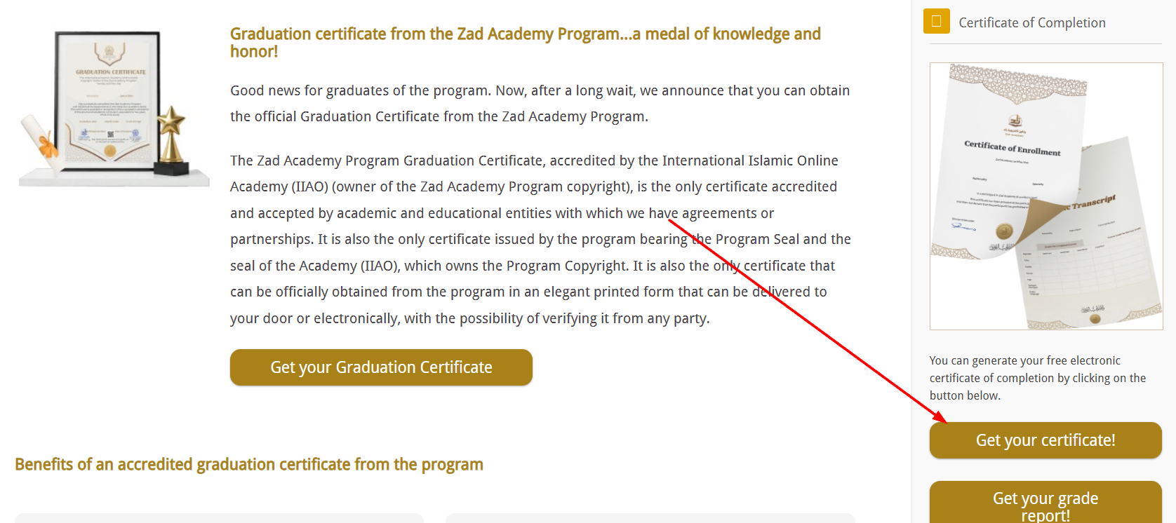 To obtain your certificate of completion, please log in to your account and click on the "Get your Certificate" button. After the certificate opens in a new page, you can print it directly or download it.